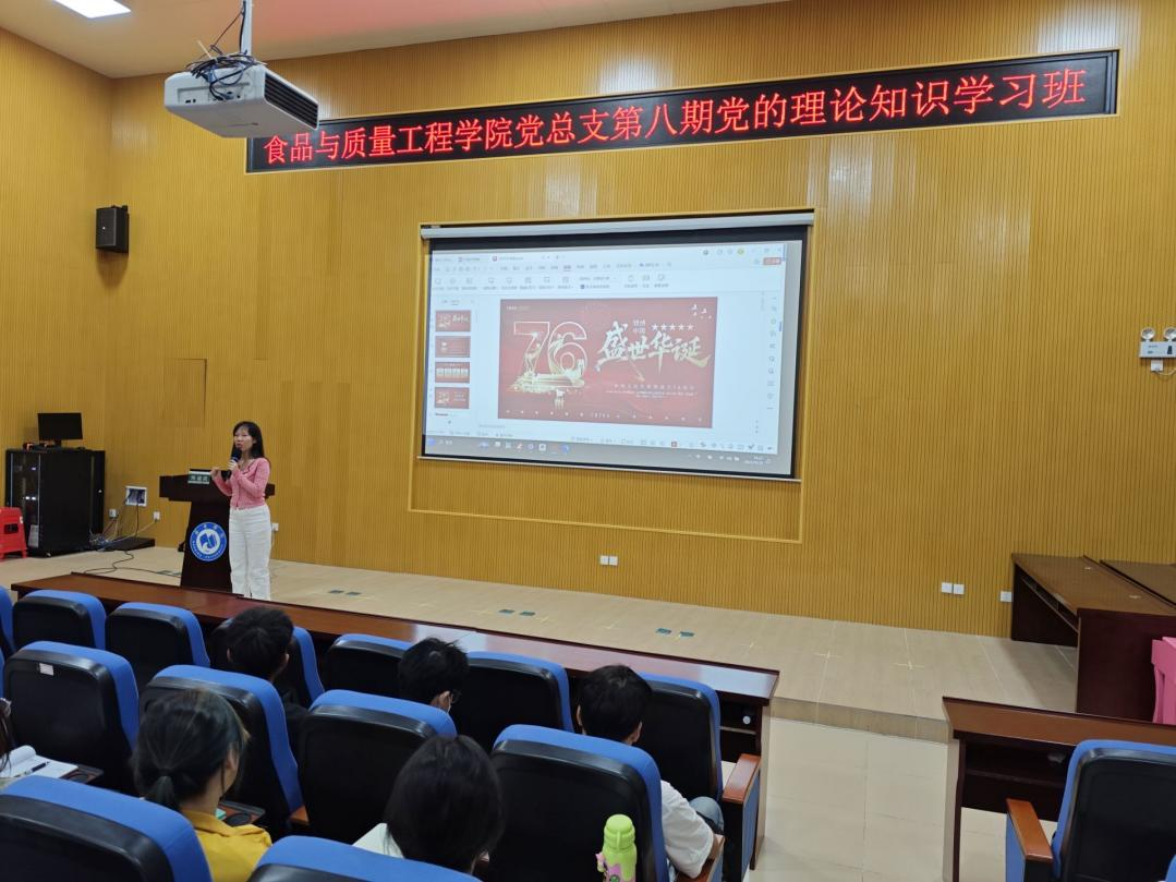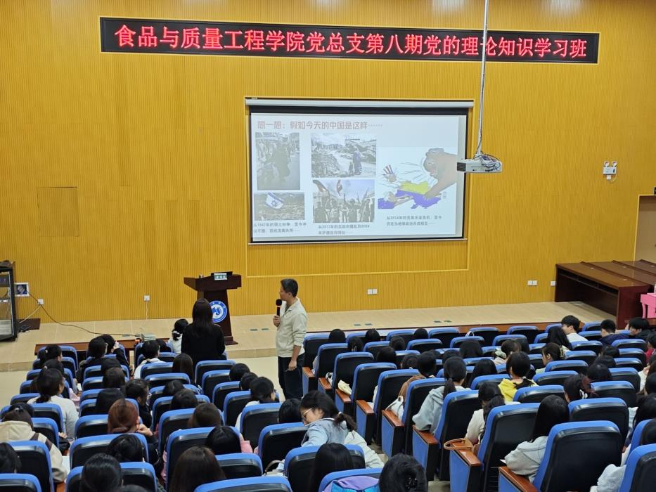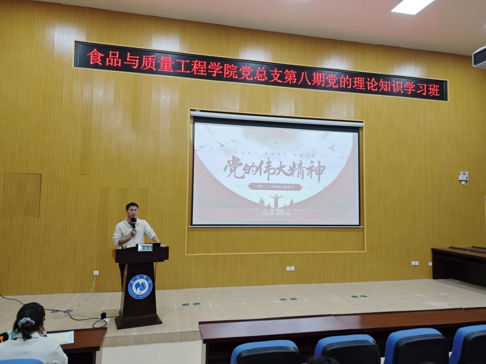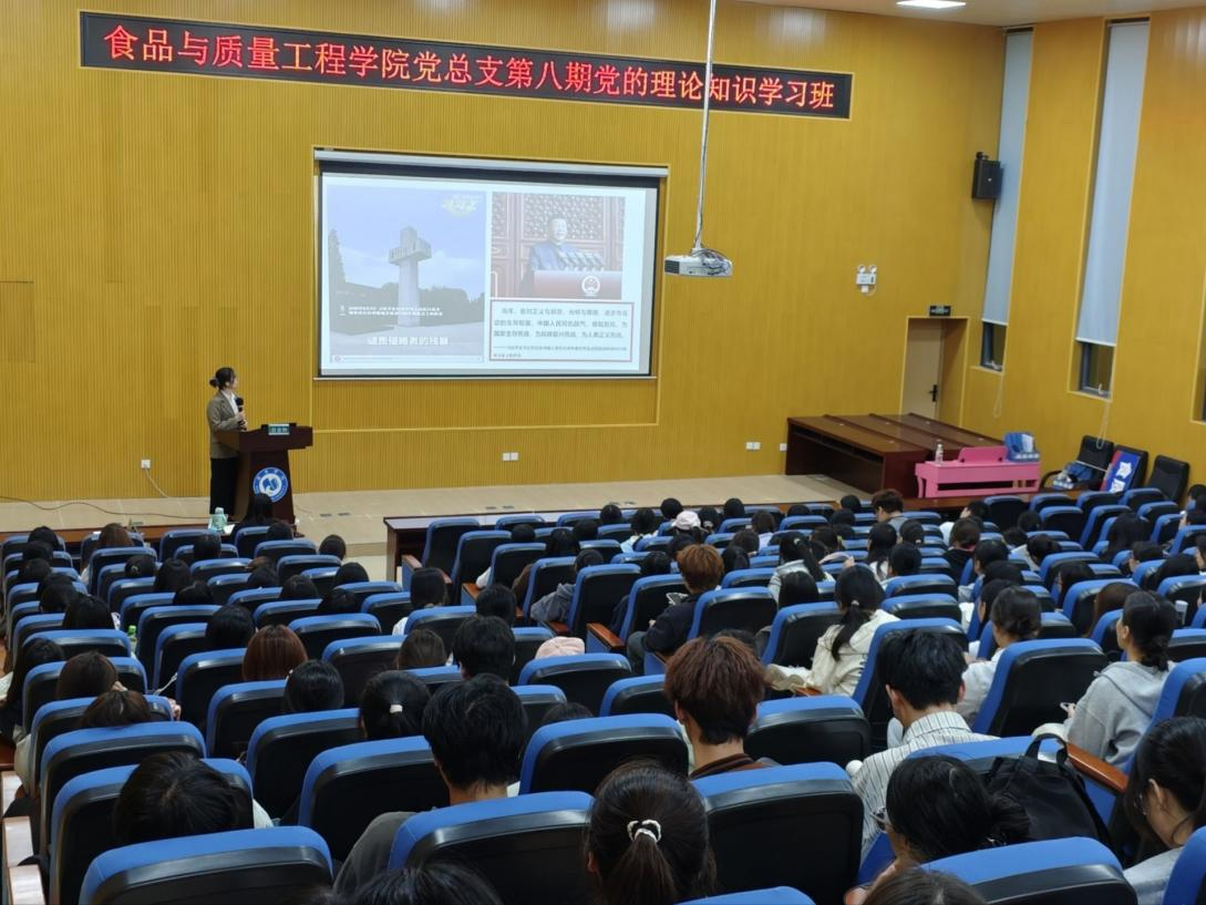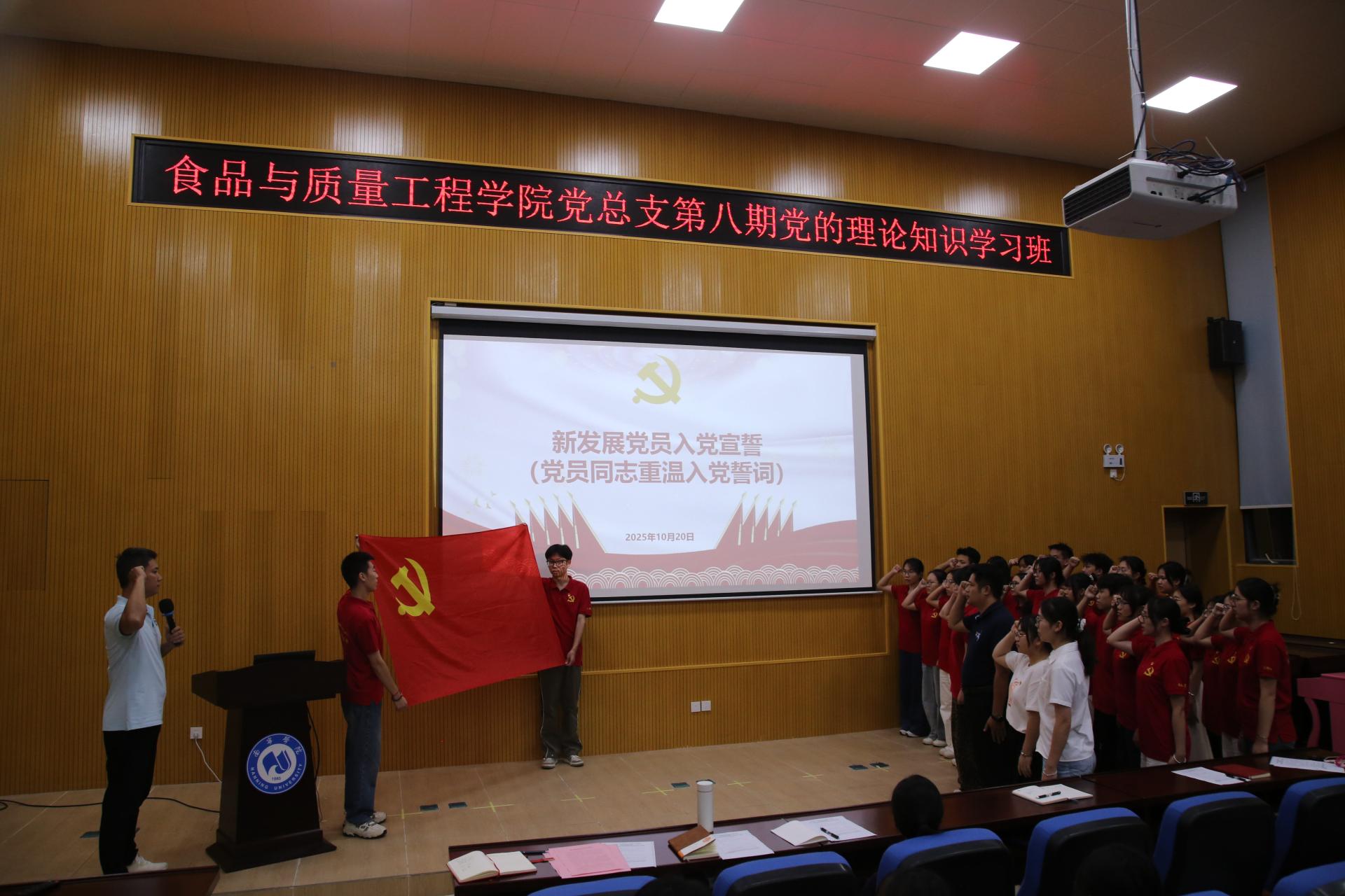 为深入学习贯彻习近平新时代中国特色社会主义思想,进一步提升我院入党申请人、入党积极分子、发展对象、党员同志对党的理论知识的理解和政治素养,坚定理想信念、增强党性修养,进一步赋能学校办学理念,促进学生德智体美劳全面发展。2025年10月20日,由食品与质量工程学院党总支举办的第八期党的理论知识学习班在南硅谷C106如期举办。开班仪式由吴瑶同志主持,党总支副书记潘炳捷同志、党总支专职组织员黄国俊同志、学生第二党支部书记陈园园同志、学生科辅导员颜金柳同志、学生科助理陈观莹老师以及全体学员参加。