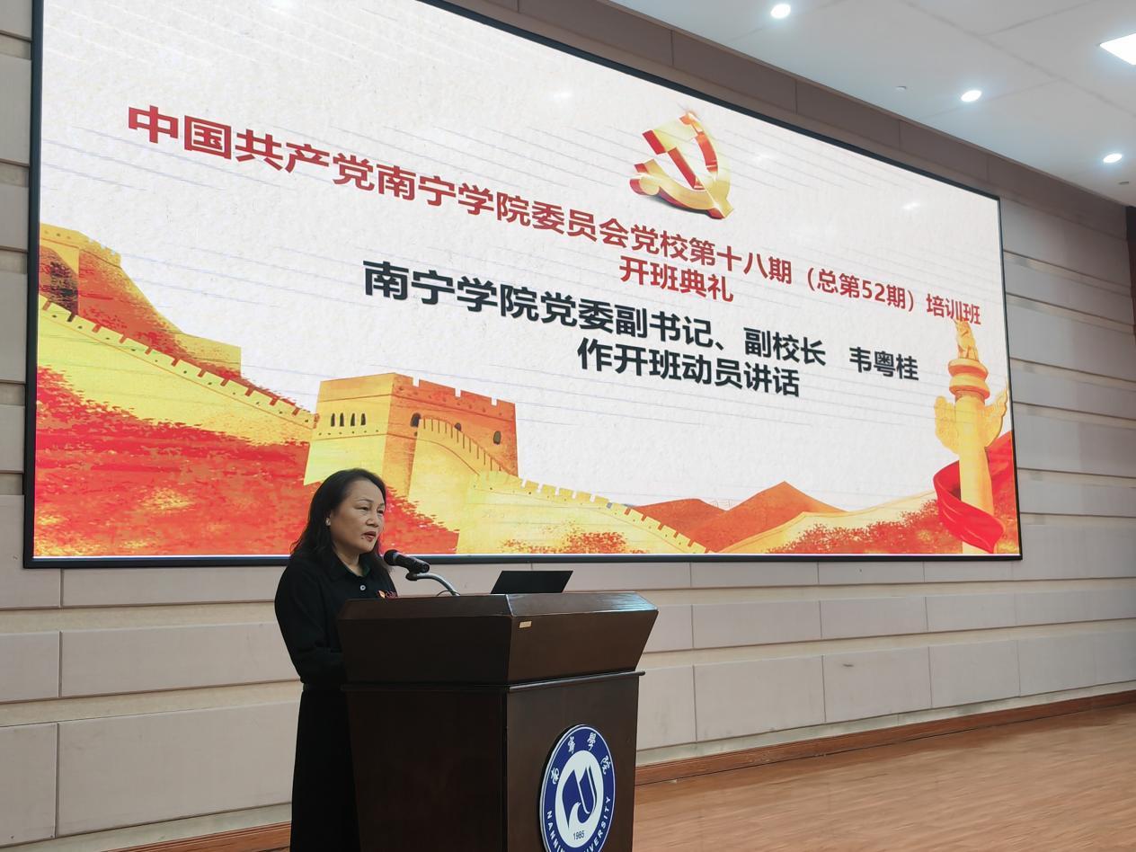 典礼在庄严的国歌声中拉开帷幕。校党委副书记、副校长韦粤桂作开班动员讲话。她代表学校党委对全体学员表示热烈欢迎,并对全体培训班学员提出希望和要求:一是深化认识,珍惜机会,深刻理解培训的重要性。要深刻领悟“两个确立”的决定性意义,增强“四个意识”、坚定“四个自信”、做到“两个维护”,筑牢信仰之基。二是聚焦学习重点,全面提升自身素质。通过课程学习,持续提高自身政治理论水平,筑牢思想根基。三是严守学习纪律,确保学习取得实效。要认真做好学习笔记,积极参加讨论交流,做到学以致用、知行合一。通过学习,不仅要提高自己的理论水平和业务能力,还要培养良好的学风和作风,树立党校学员的良好形象。同时,她还特别向学生党支部书记们强调,要当好“领头雁”,在理论学习上走在前、作表率;要当好“贴心人”,在联系服务同学上要用心用情;要当好“监督员”,在严守纪律规矩上铁面无私;要当好“践行者”,在学用结合上彰显成效。