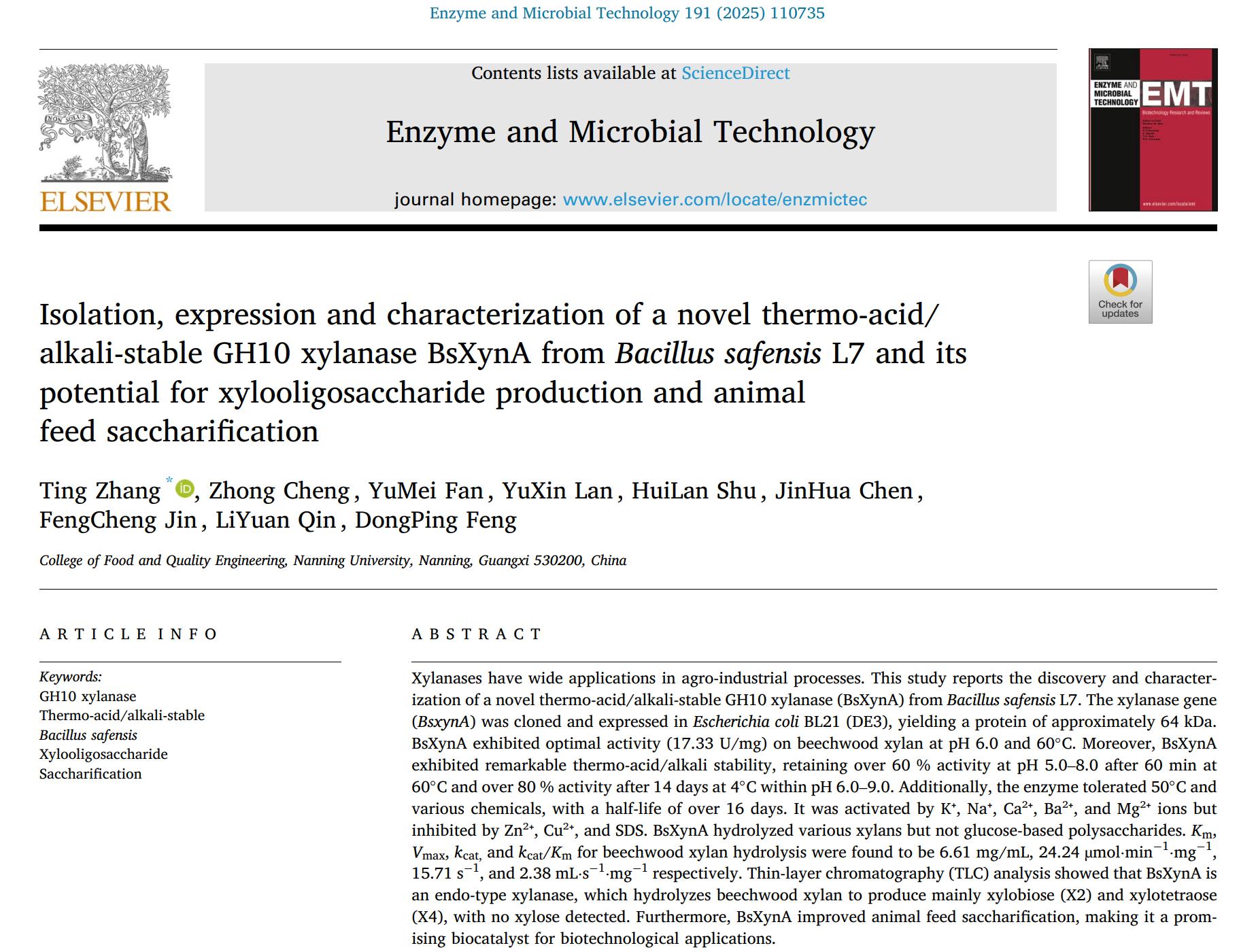 近日,我院食品酶开发与利用团队张婷博士以第一作者和通讯作者身份在国际经典期刊《Enzyme and Microbial Technology》(IF=3.7,中科院3区,非OA)上发表了题为《Isolation, expression and characterization of a novel thermo-acidalkali-stable GH10 xylanase BsXynA from Bacillus safensis L7 and its potential for xylooligosaccharide production and animal feed》的论文(南宁学院为第一单位)。该研究得到了南宁市“邕江计划”青年人才专项项目(RC20230202)和广西壮族自治区自然科学基金(2023GXNSFAA026235、2024GXNSFBA010330)的资助。食品质量与安全专业2020级覃丽媛和冯东萍、2021级范玉梅和金凤承、2022级兰雨馨、舒慧兰和陈金华几位同学和食品酶开发与利用团队程忠博士共同参与及发表了此篇论文。