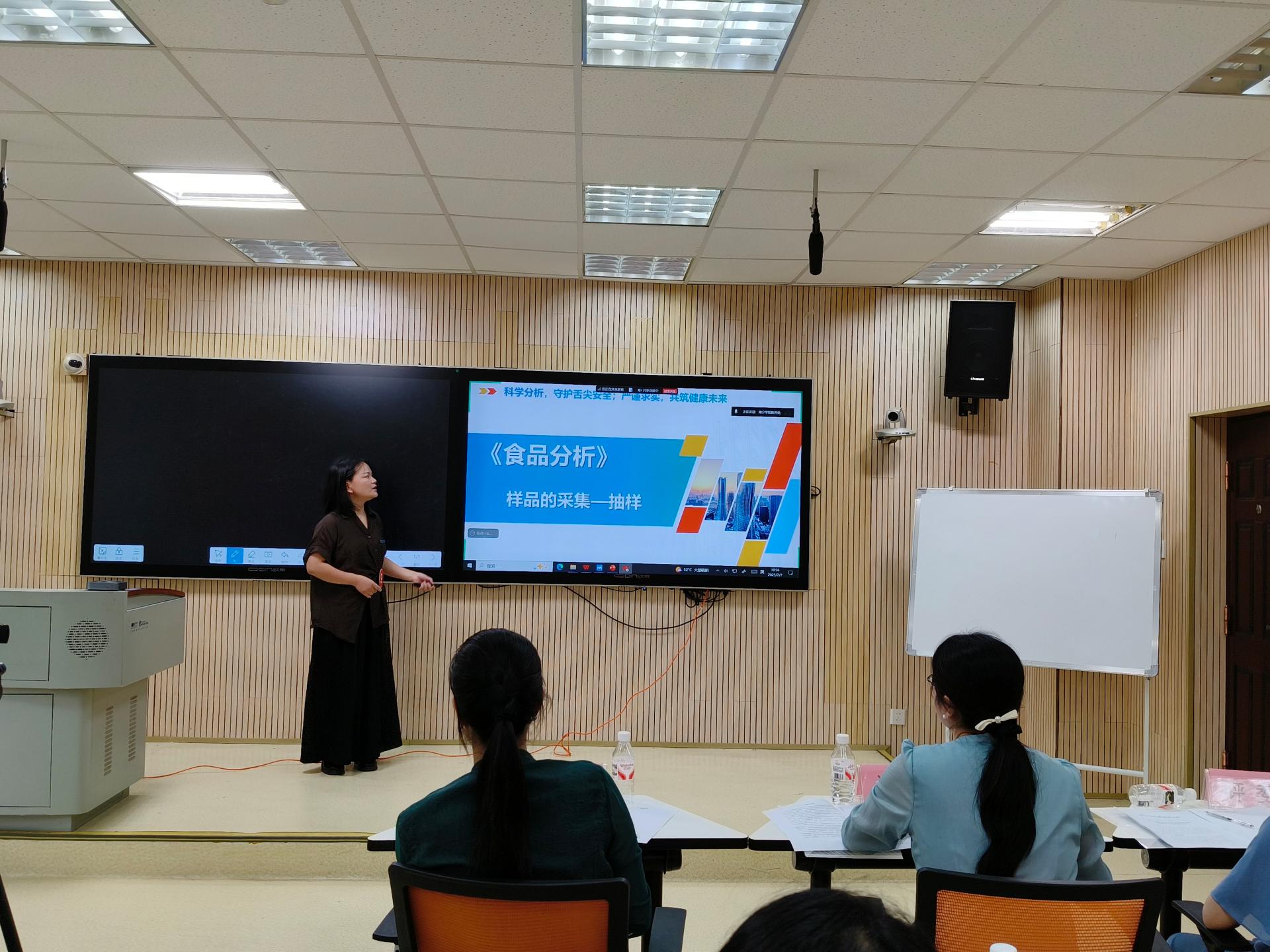比赛现场,许文婷老师教态亲切自然,教学语言简洁明了。通过精心设计的教学环节,她将专业知识与思政元素有机融合,让学生在掌握专业技能的同时,接受思想政治教育的熏陶。例如,讲解抽样方法时,她结合实际案例强调科学严谨态度在食品分析工作中的重要性,引导学生树立正确的职业观与价值观;同时鼓励学生积极思考、勇于创新,培养探索精神和实践能力。
