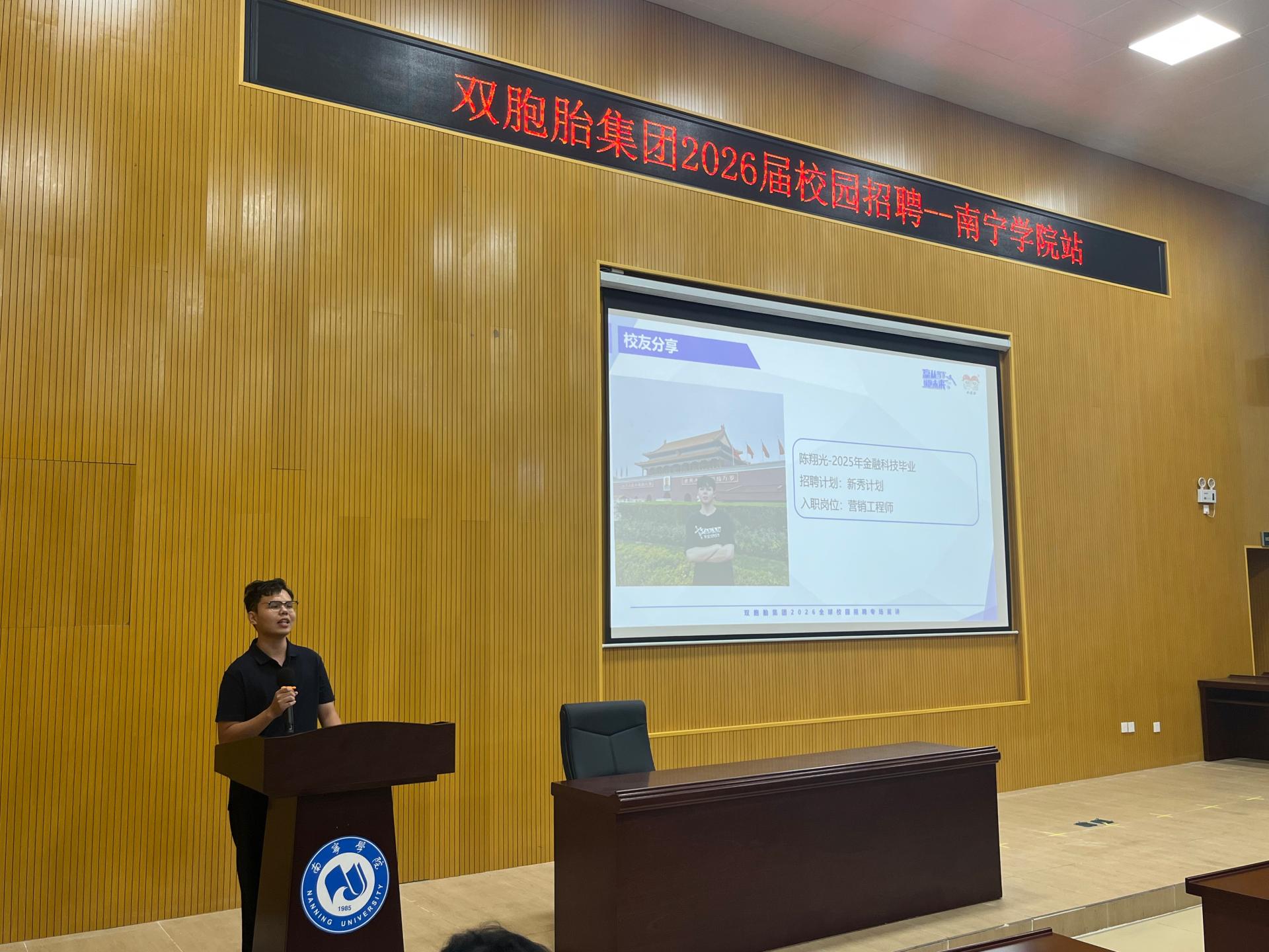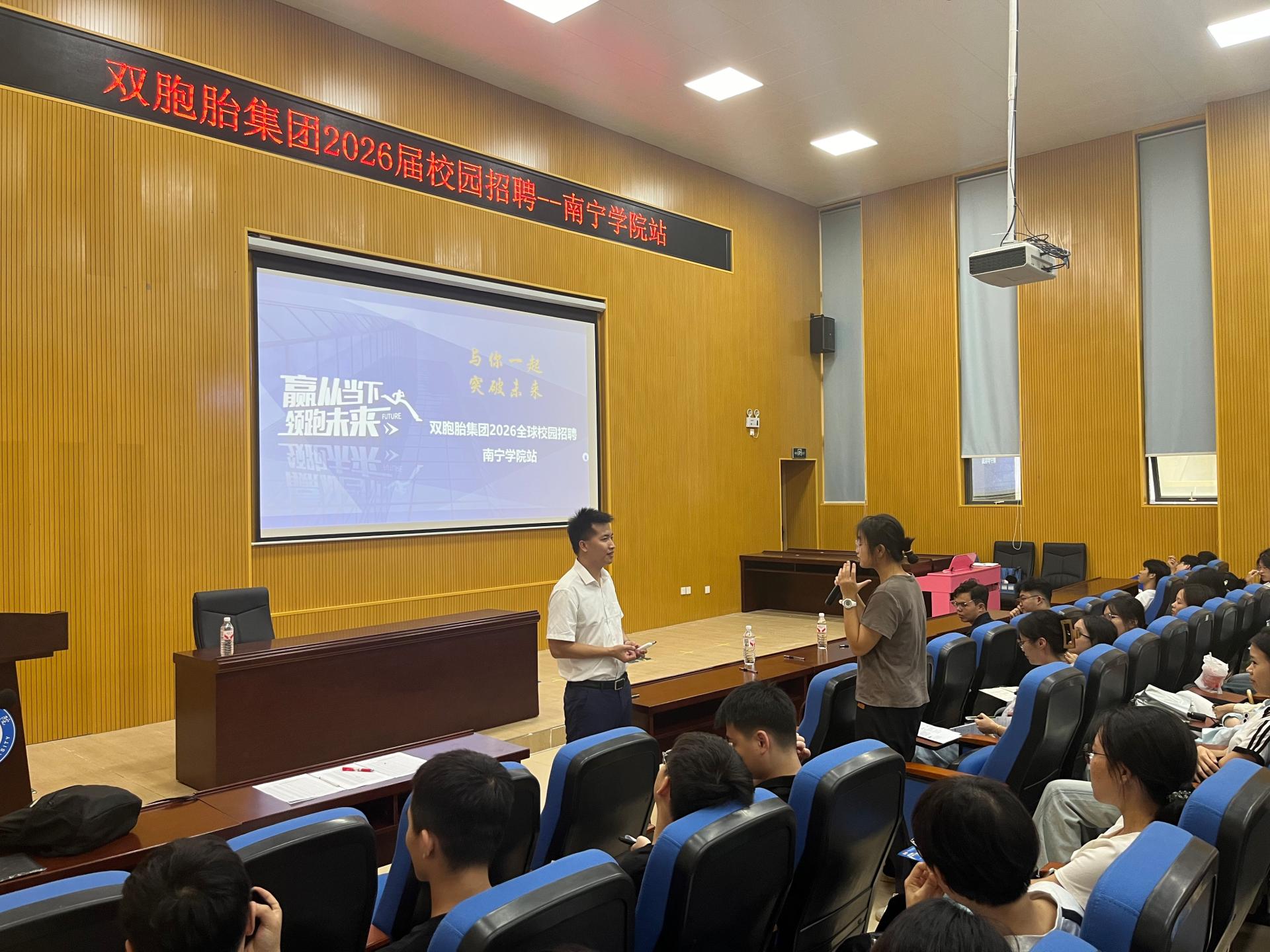 为增强同学们对企业的直观了解,本次宣讲会特别设置了“学长分享”环节。两位已入职双胞胎集团的南宁学院优秀校友重返母校,结合自身经历分享了个人职业发展及成长经验。他们从职场新人的角度,讲述了在集团的职业发展、学习成长与文化氛围,以真实、朴素的案例,侧面有力地展现了双胞胎集团对人才培养的重视和招揽英才的十足诚意,引发了在场同学的强烈共鸣。