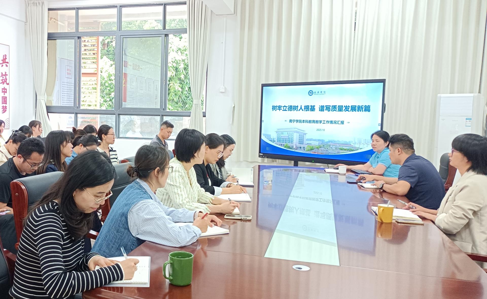 为扎实推进南宁学院本科教育教学审核评估工作,2025年10月28日下午,食品与质量工程学院在南硅谷C214会议室召开本科教育教学审核评估工作推进会。学院院长庞湘萍、副院长韦云伊、副书记潘炳捷及全院教职工参会,会议由庞湘萍院长主持。