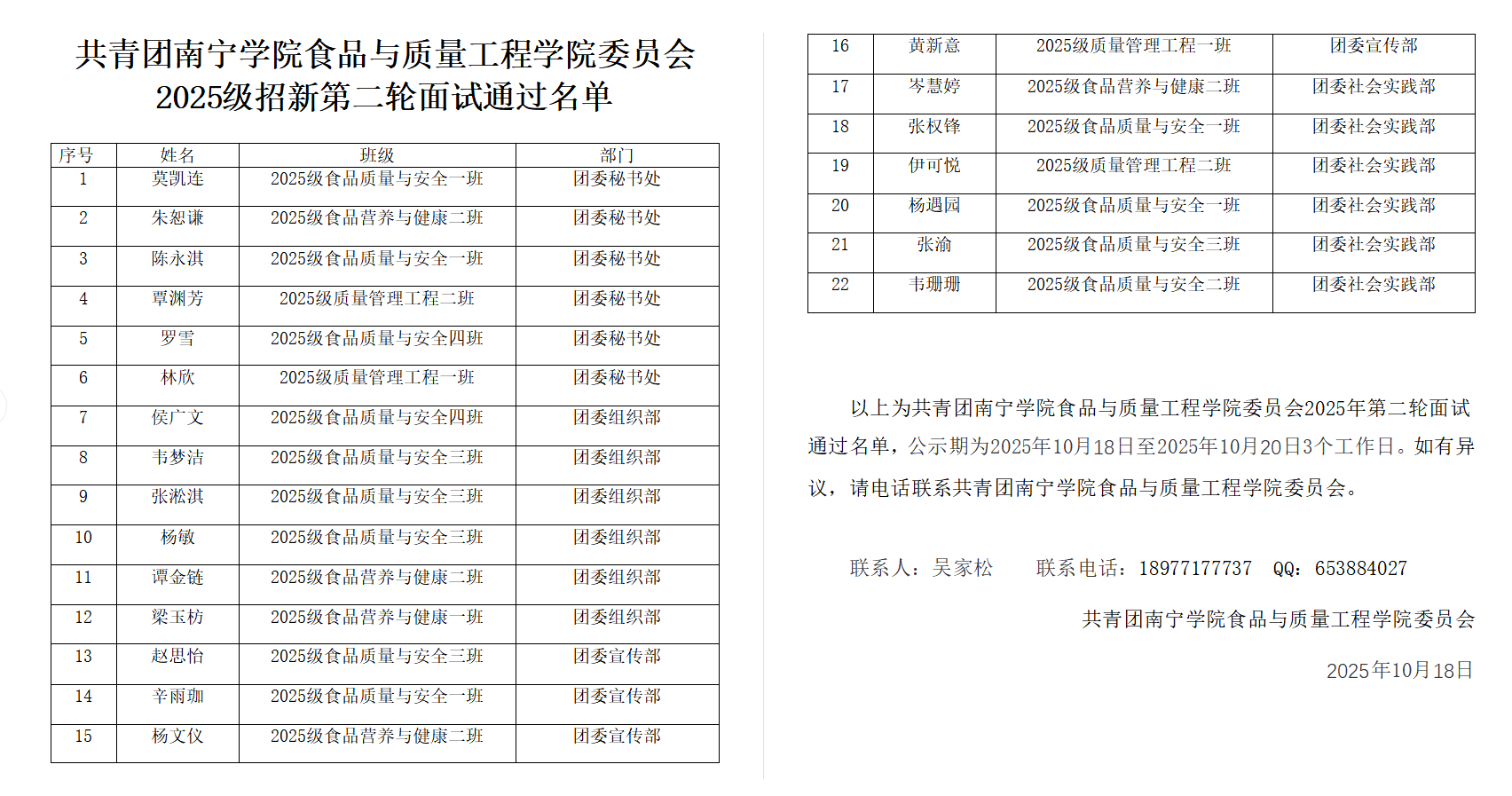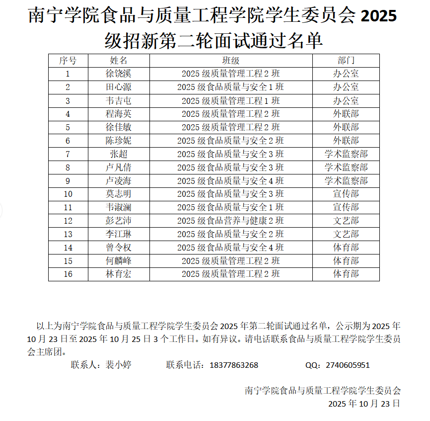 从首轮的初露锋芒到二轮的深度展现,本次招新面试既为新生提供了展现自我的平台,也为学院团学组织筛选出一批有热情、有能力的新鲜血液。目前,最终录用名单已确定,期待新成员们以青春之力赋能团学工作,在未来的岗位上积极担当、协同奋进,共同书写食品与质量工程学院团学发展的新篇章。(食品与质量工程学院学生会宣传部撰稿 图/陈珏杏 文/文琪卉)(一审一校:徐鸿宇 二审二校:陈园园 三审三校:潘炳捷)