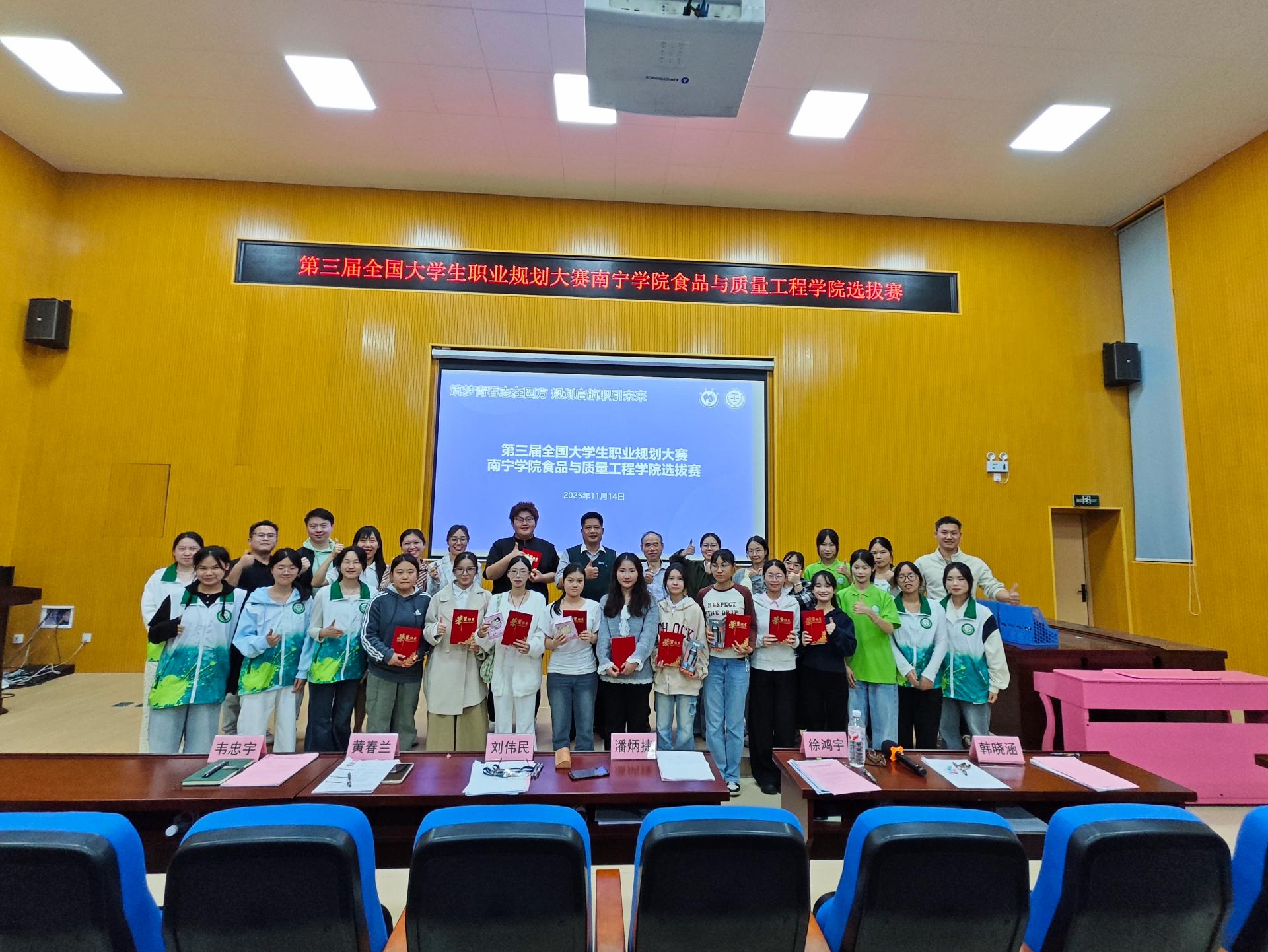 11月14日晚,第三届全国大学生职业规划大赛南宁学院食品与质量工程学院选拔赛在南硅谷C106教室顺利举行。本次比赛旨增强大学生职业规划意识,引导学生树立正确的成才观、就业观和择业观,提升就业竞争力,同时也为全院学生提供了一次宝贵的学习与交流机会。