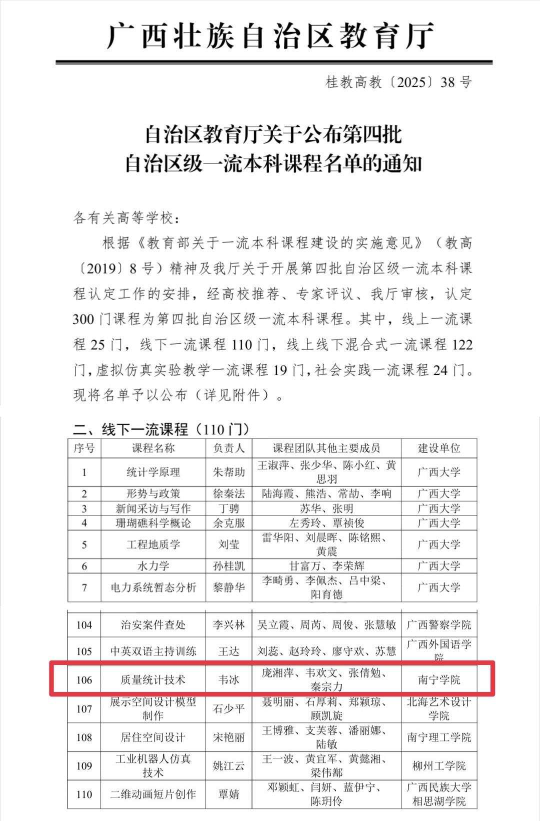 近日,自治区教育厅正式公布了第四批自治区级一流本科课程认定结果。食品与质量工程学院申报的《质量统计技术》课程成功入选,被认定为“自治区级线下一流本科课程”。该课程由韦冰老师担任负责人,庞湘萍、韦欢文、张倩勉、秦宗力等老师共同组成课程团队。本次认定工作经过严格的高校推荐、专家评议及主管部门审核程序,《质量统计技术》课程的入选,标志着学院在课程建设与教学改革方面取得了新的突破。