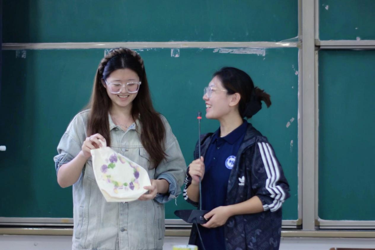 活动现场暖意融融,各区域秩序井然又充满欢声笑语。在植物拓染区,同学们化身“自然魔法师”,轻敲慢拓间,植物的脉络与色彩在布面上悄然绽放,寻常帆布包蜕变为独一无二的自然艺术品。串珠DIY区宛如“创意工坊”,五彩的珠子与丝线在指尖灵活穿梭,同学们在构思与搭配中锻炼了专注力与审美力。扭扭棒创意区则洋溢着天真与惊喜,柔软的彩棒经巧手弯折缠绕,变幻为灵动的小南瓜、迷你花束等可爱造型,重拾了纯粹的创造乐趣。活动尾声的作品展示与分享环节,同学们踊跃分享创作心得与过程中发生的趣事,让手作的温度、美的体验与心灵的收获在交流中持续传递与共鸣。